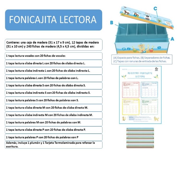 Estimula la lectura de las vocales y cuatro consonantes /L/, /S/, /M/, /P/, en sílaba directa, sílaba indirecta y en palabras.